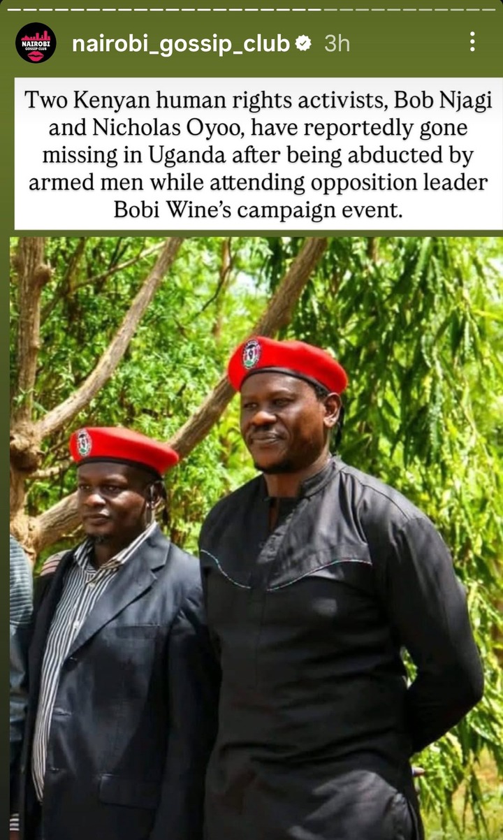 Information obtained from reliable sources have revealed that two Kenyan activists, Bob Njagi and Nicholas Oyoo are still missing. The two who were attending the opposition leader of Uganda, Bobi Wine’s campaign event in Uganda, were ambushed by armed men who abducted them.
