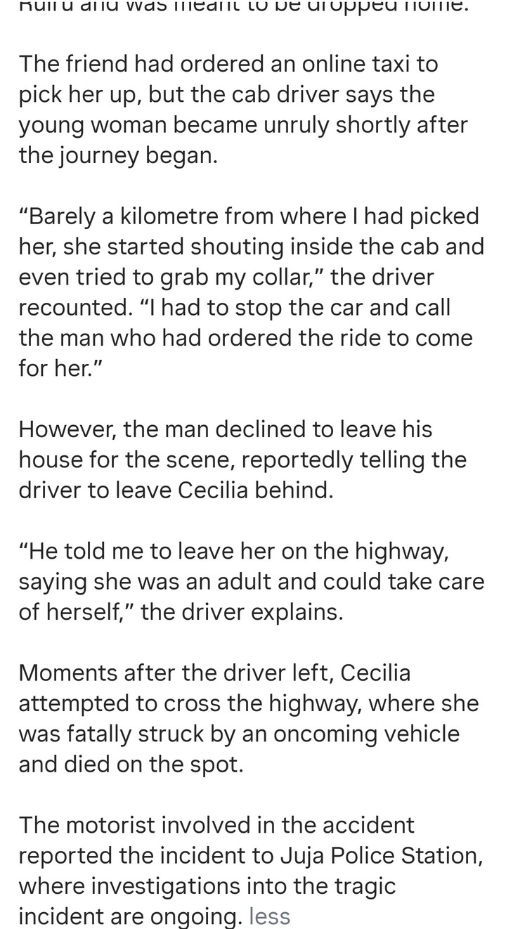 Reliable sources have revealed that Cecilia was intoxicated, and she was from her boyfriends place , somewhere in Ruiru. The man ordered an online taxi for her, and she was to be dropped at her home.