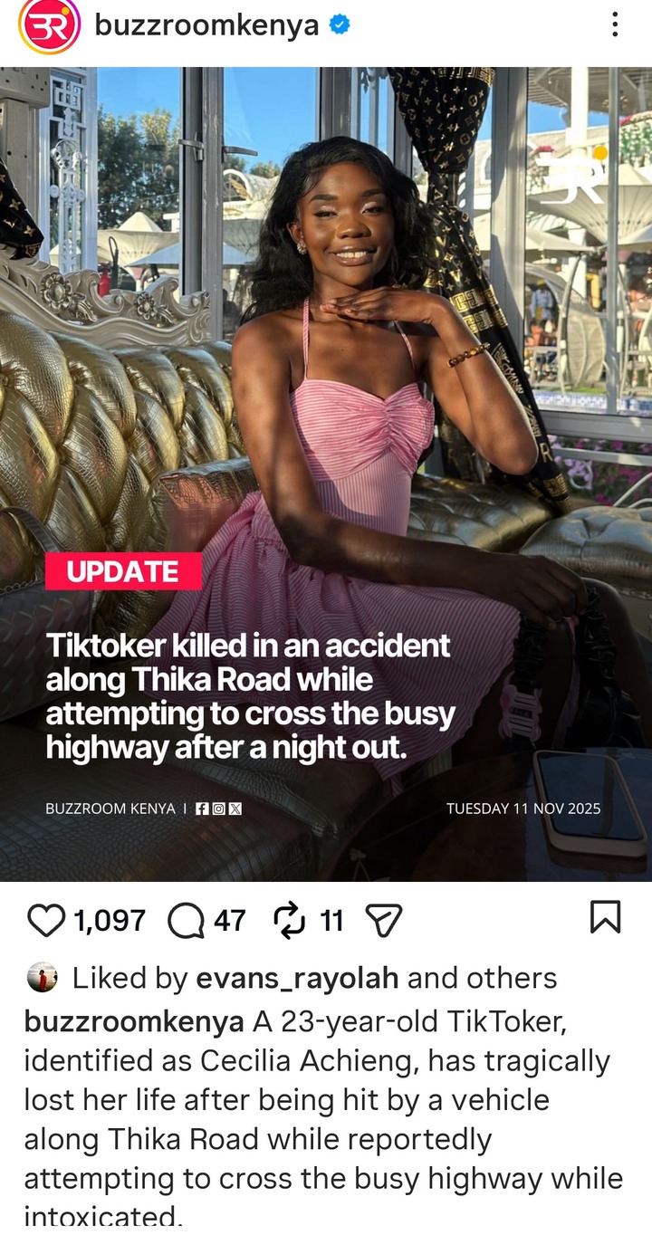 A 23 years old tiktoker, Cecilia Achieng is no more, she died along Thika road while she was attempting to cross the busy highway while heavily drunk. She was hit by an incoming vehicle and she died on the spot.