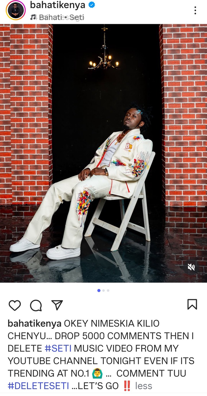 Bahati posted on his Instagram page that if he gets 5000 comments from Kenyans, then he will go ahead and delete the song from YouTube. The song has no any moral values to the society, it is a club song that is encouraging women on styles of having intercourse, and the video seems to be very vulgar, that is why most Kenyans want Bahati to delete it from YouTube.
