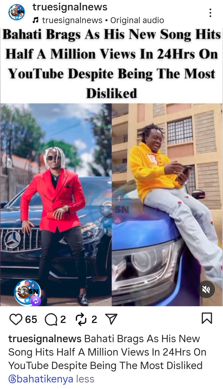 Despite all the hate and dislikes from Kenyans, musician Bahati has come out openly to brag how the song is performing very well on YouTube. The song has already gained over 500,000 views on YouTube and this clearly breaks the record he had set before of gaining 300,000 views on YouTube in 24 hours.