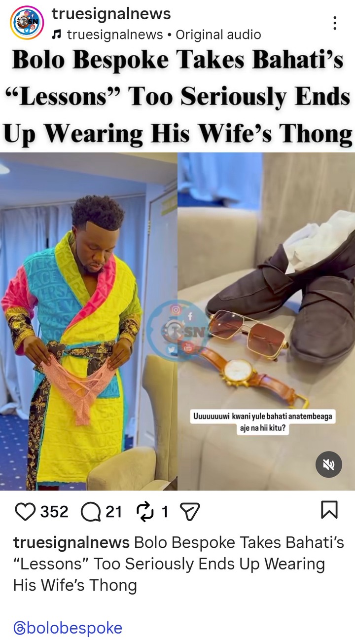 It seems like Bolo Bespoke, who is the official designer of Bahati, is indeed following the footsteps of Bahati, just a month after Bahati stepped out wearing Diana Marua’s thong, now Bolo Bespoke decided to drip in a suit while wearing the thong of his wife Mueni.