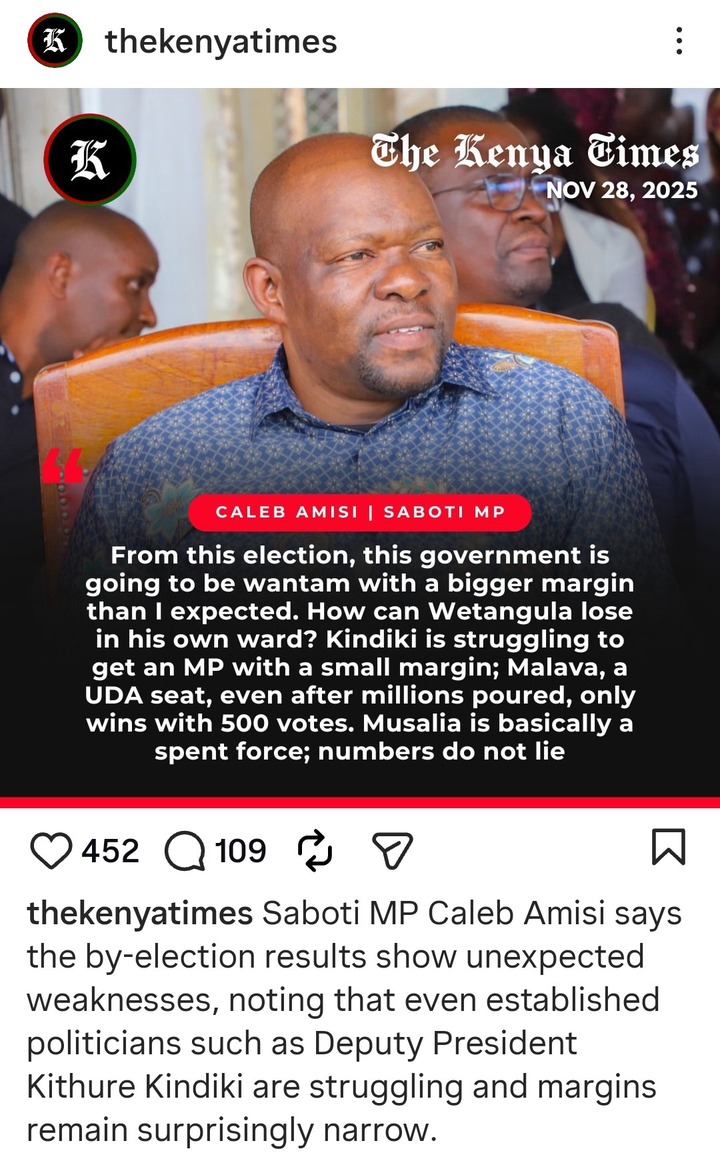 Amisi said that if you see the areas where UDA won, especially the two MP seats, that is for Malava and Mbeere North, it is clear that they had to struggle to get votes. The margin between the competitors is too small, and even questionable.
