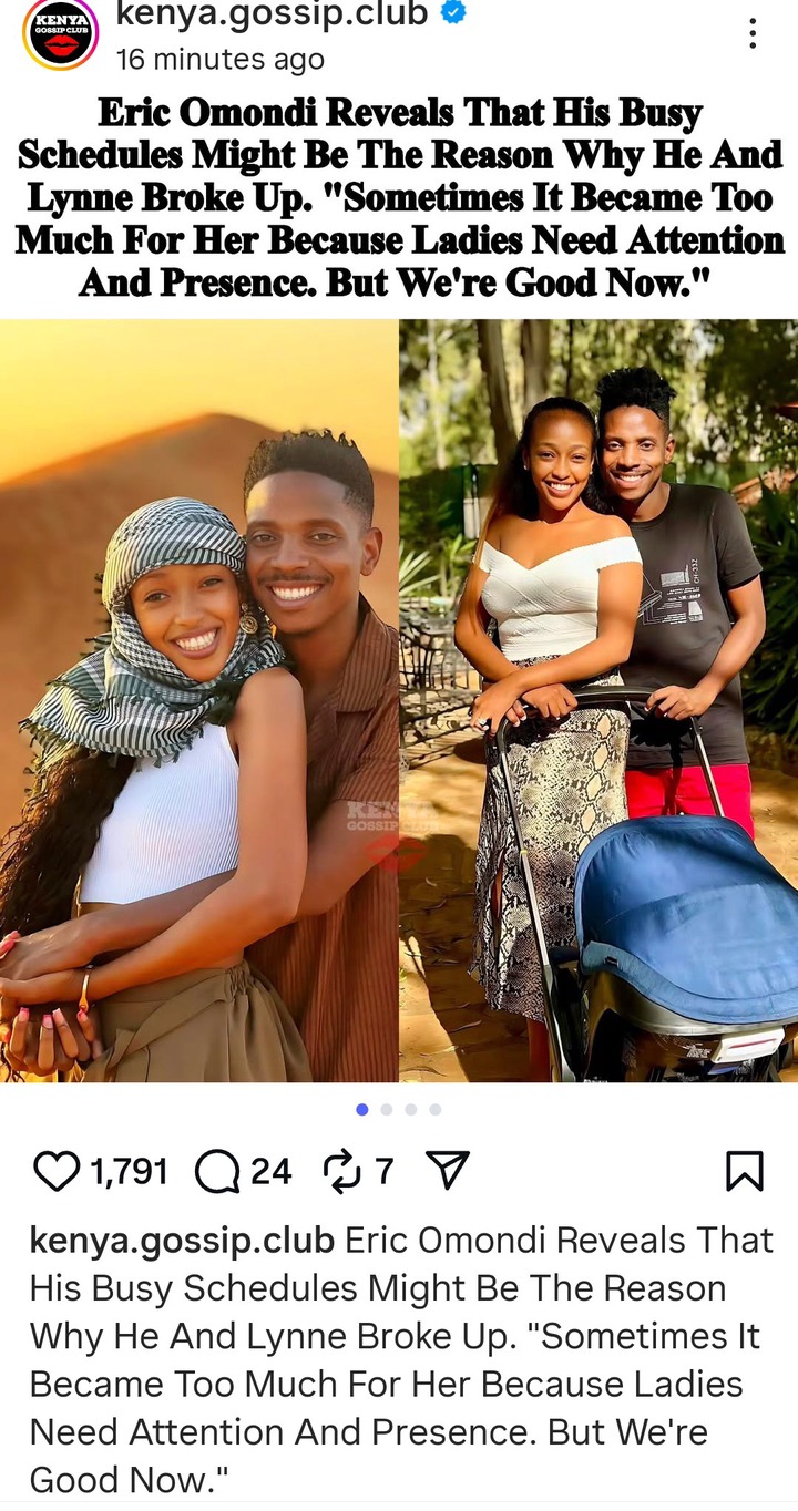 The two separated earlier this year and Lynne was the one who shared the break up post and made it public that they are no longer dating. She said that they will be co-parenting. Eric Omondi has never spoke about it, he has been busy online helping Kenyans to raise money to support vulnerable people in the society. He is the CEO of Sisi kwa Sisi, and he is always traveling.