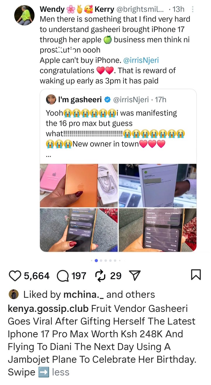 Fruits Seller Gasheeri, Gifts Herself Iphone 17Promax Worth Ksh.248K & Fly’s To Diani Using Jambojet