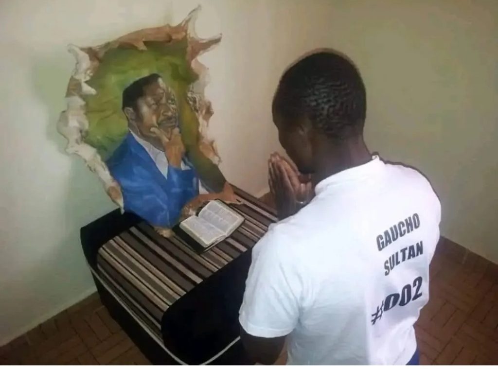 Gaucho decided to share a photo of him, in a special room inside his house, and he was busy worshipping Raila Odinga. He has a photo of Raila inside the room, and he was kneeling down, and seemed to be worshipping him.