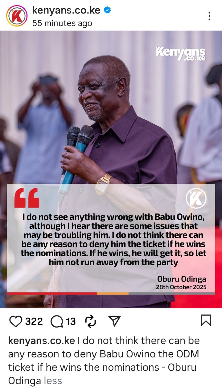 ODM party leader Oburu Odinga has urged Babu Owino to remain in the party, according to him, he doesn’t see anything wrong with Babu Owino and there is no any reason to deny him the ODM ticket to vie for the governor seat in Nairobi 2027.