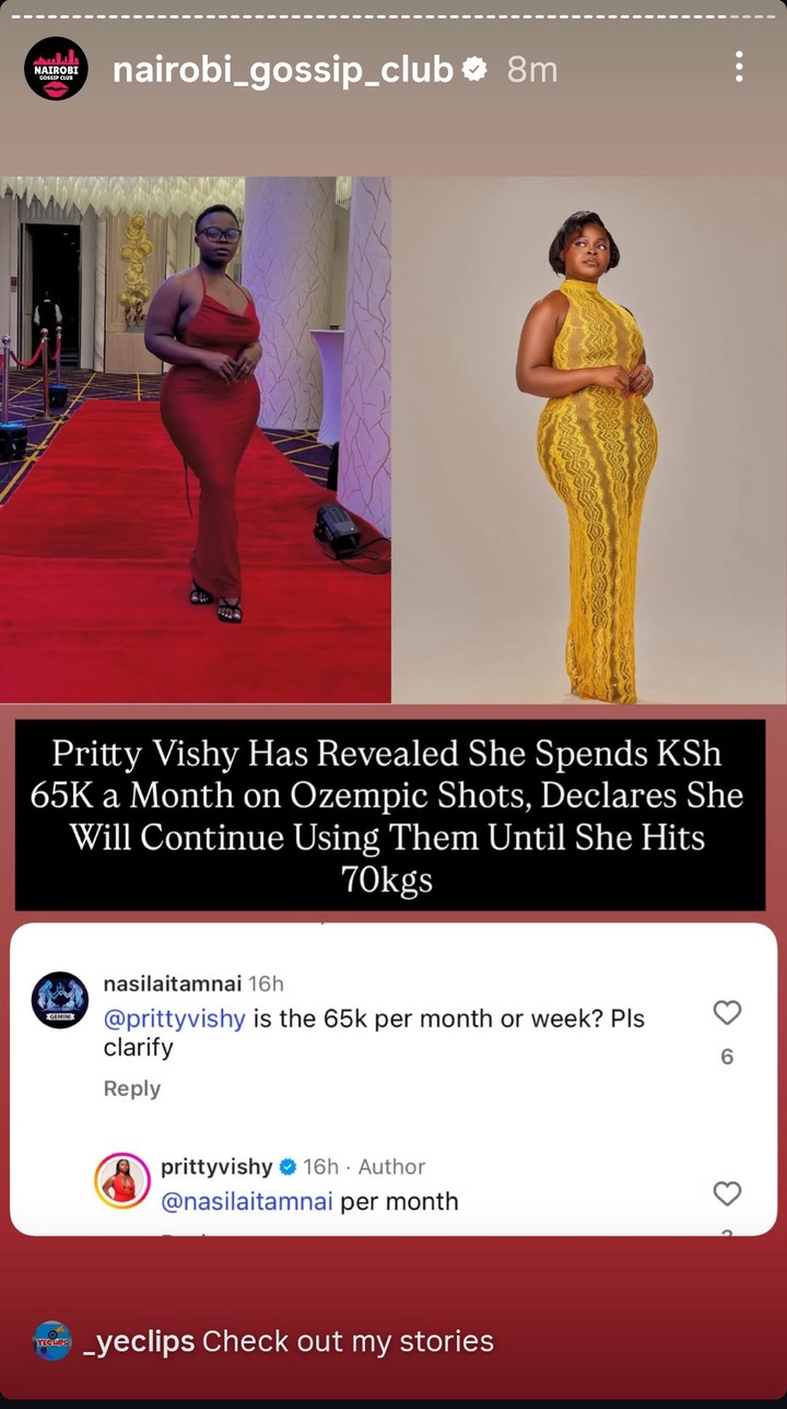 Pritty Vishy is still on her journey of achieving a very admirable body shape and figure, after spending over Ksh.400,000 on butt surgery, Pritty Vishy is now on the weight loss journey, she spends Ksh.65,000 monthly paying for Ozempic weight loss shots.