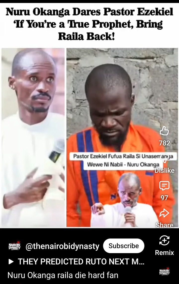 In the video that has really caused stir online, Nuru Okanga said that, it is time for Pastor Ezekiel to prove to Kenyans that he is a real man of God. He said that the only favour he can do to Kenyans now, is by bringing back Raila Odinga to life.