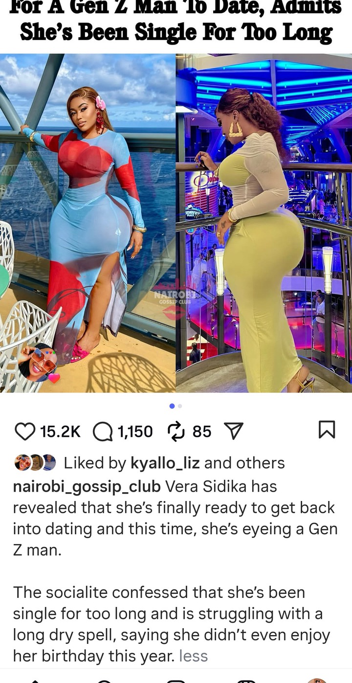 She even admitted that she didn’t enjoy her birthday, because she had no man to make it more complete. Vera Sidika is now tired of being single and she urgently wants a GenZ young man who can be her boyfriend and satisfy her conjugal rights.