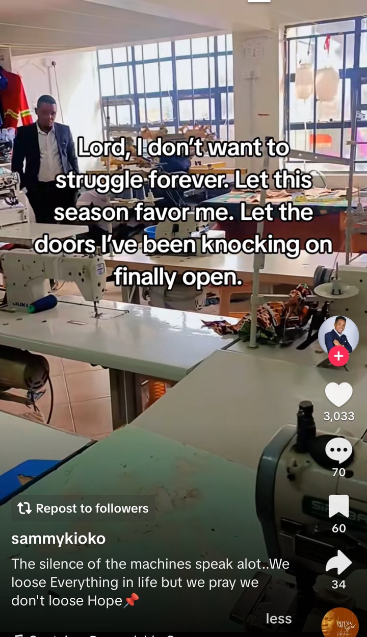 Kioko shared a video of the production area, where his workers used to design clothes, especially suits, it was just silent and the room had only the machines. He captioned that he has lost everything but he is still hopeful that things will get better soon.