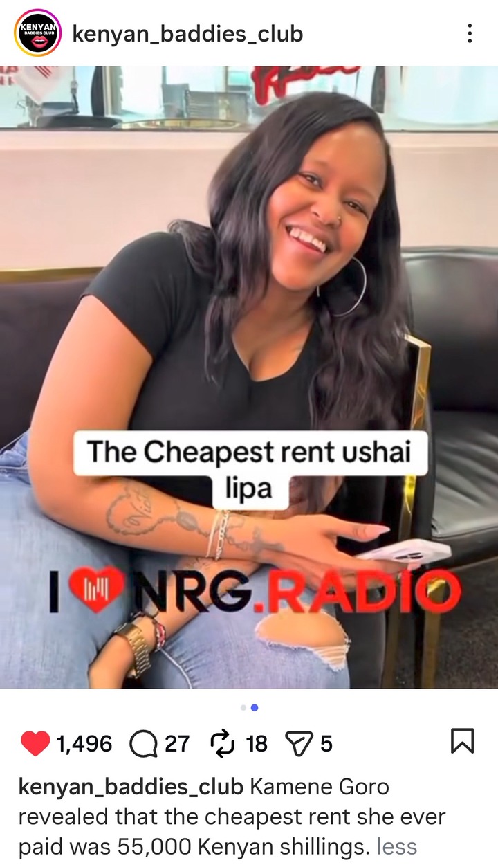 Nrg radio presenter and famous media personality, event organiser and club host, Kamene Goro has caused stir online, after she decided to open up on the cheapest house rent she has ever paid in Nairobi.