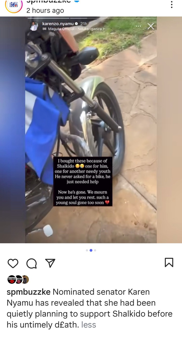 Controversial celebrity and nominated senator has revealed that, she has been secretly planning to gift gengetone artist Shalkido a new motorbike, before his death. Nyamu said that she has been planning to support her, and it was to be like a surprise. When Shalkido was suffering, Karen Nyamu was among the people he called for help, but the senator ignored him.