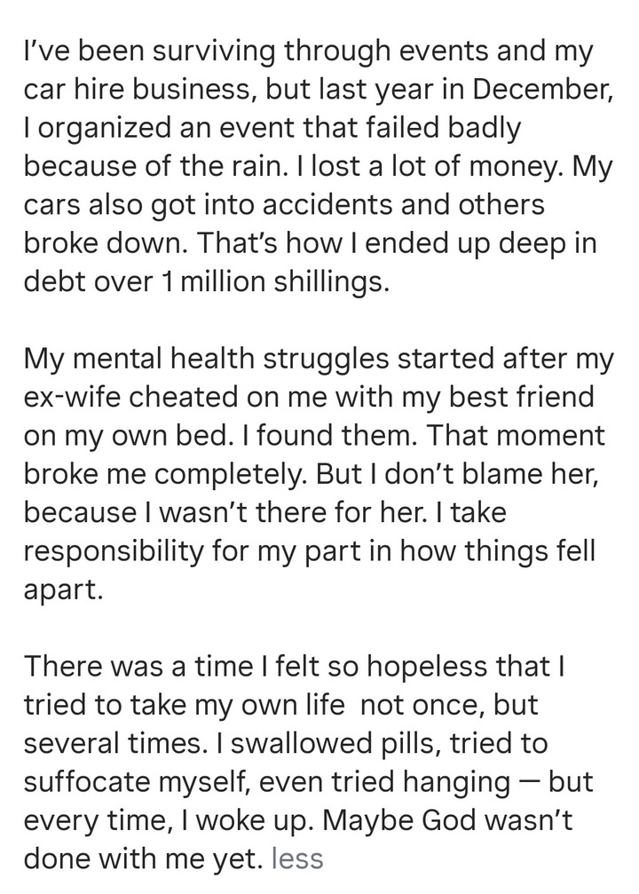 The problem is that things have been going left, the business he had invested his money, has collapsed, his car hire business has also collapsed, leaving him with a huge debt of over Ksh.1 Million.