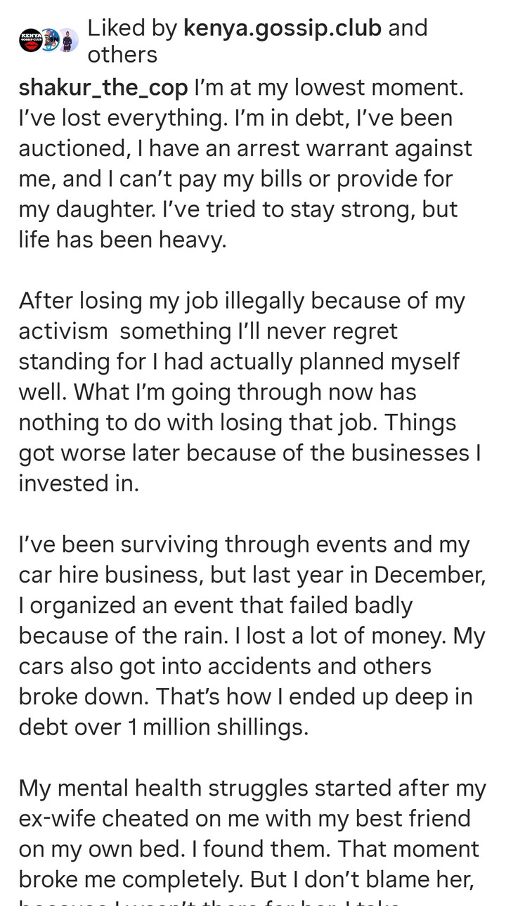 Cop shakur was among the police officers who lost their jobs for supporting the GenZs. He was at the forefront of GenZ maandamano, he was fired, and now he has decided to open up on struggling with life. He is very broke, he has huge debts, and his wife even decided to cheat on him with his best friend on their matrimonial bed.