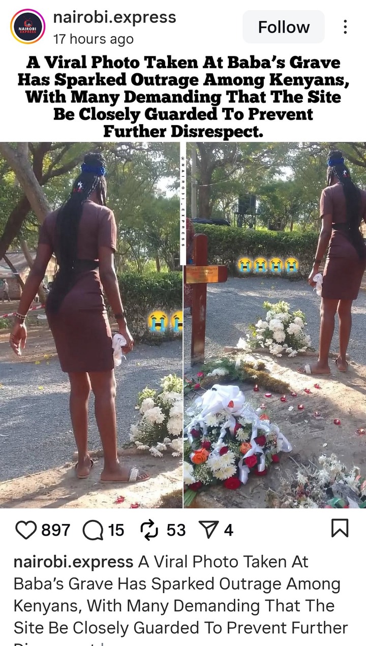 A good number of Kenyans online are very angry with the photo taken at Baba’s grave, and it was a picture of a lady who was standing on the grave. Kenyans have called it disrespect and are now demanding for the government to make sure that the grave site is closely guarded to prevent further disrespect.