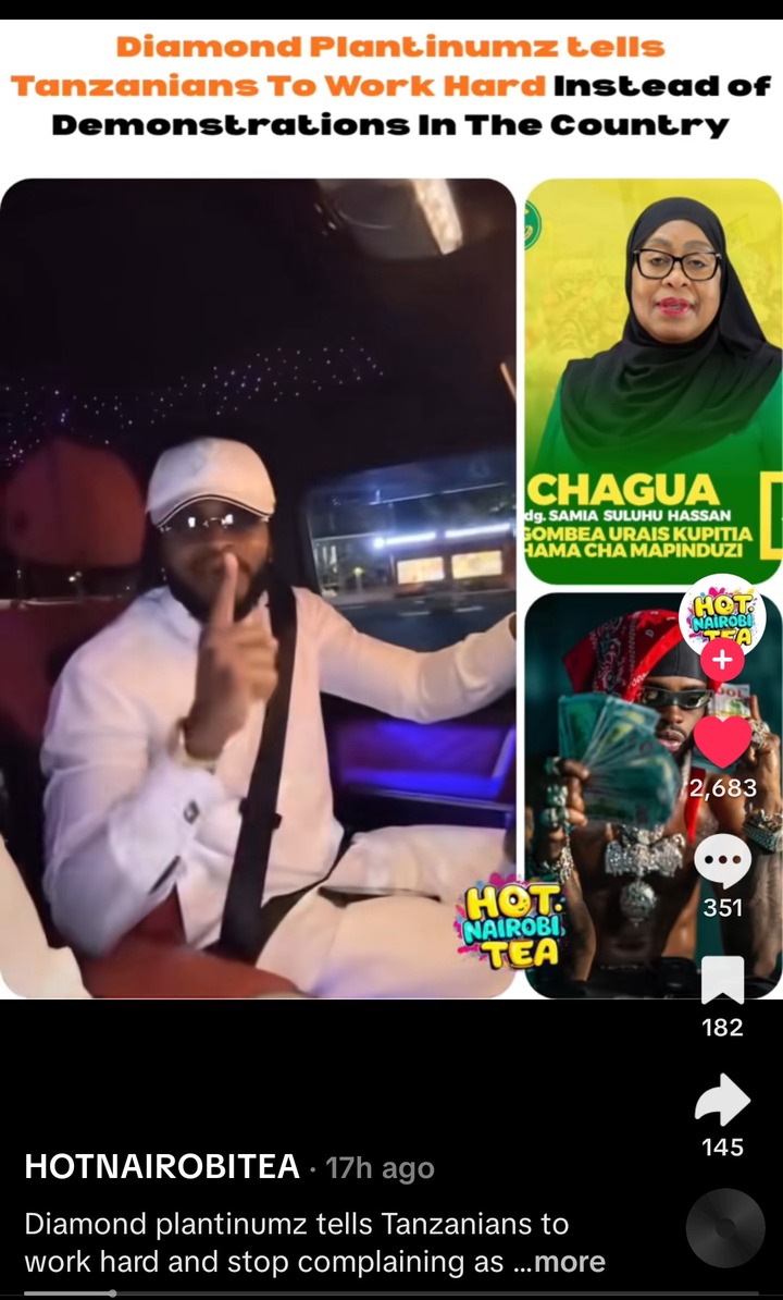 The musician said that Tanzanians like complaining instead of working hard and getting money to live a good life. According to Diamond, lazy people are the ones who are demonstrating, he said that all other governments that have ruled Tanzania, they have been worse than the government of Samia Suluhu.