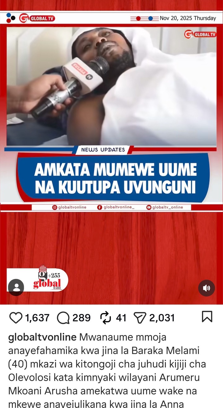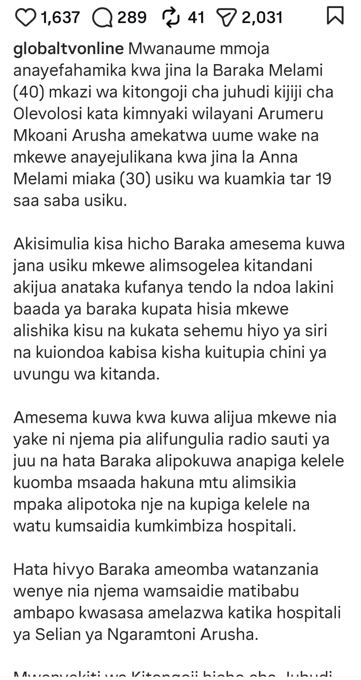 A very sad and shocking incident happened in Tanzania, Arusha area. A man identified as Baraka is admitted in hospital and he is in a critical condition, after his wife decided to chop off all his private parts.