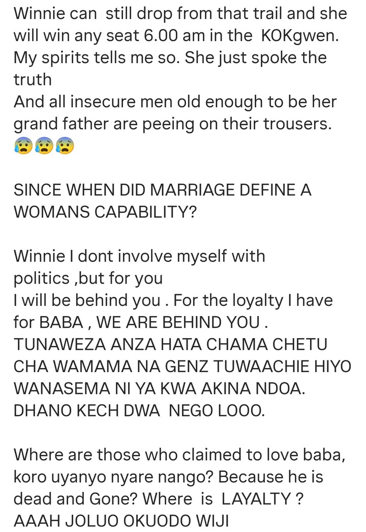 She went on and urged Winnie Odinga to ignore all those noises from online netizens, she has the support of Kenyans and anytime she wants to be on the ballot, they will support her fully, and make sure that she has won the elections.