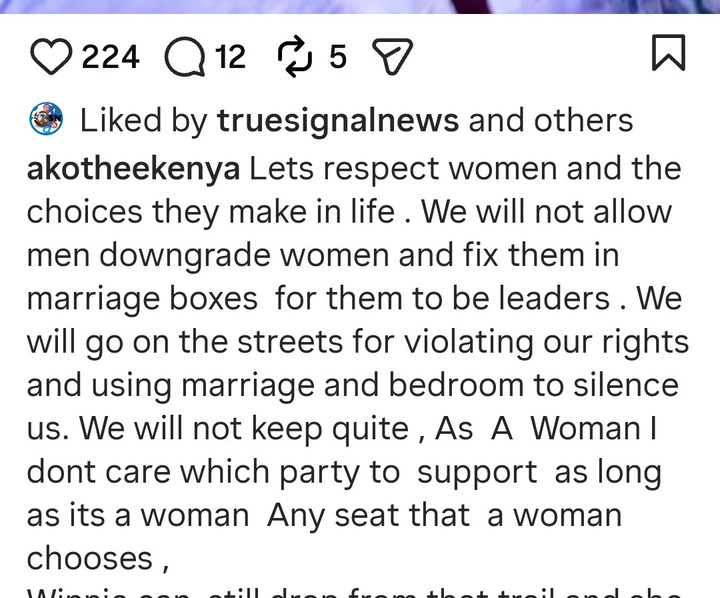 She said that Winnie Odinga has what it takes to be a leader, and people who are ruling her out because she isn’t married have tiny brains. Akothee said that she has been to marriage and back, marriage isn’t something that someone is supposed to be proud of, because it is very draining.