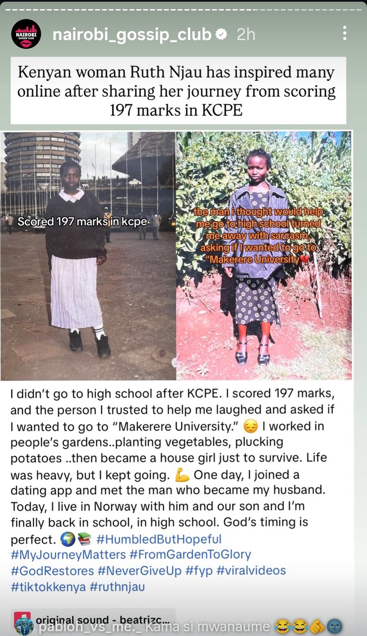 They both relocated to Norway, and now she is living her dream life abroad. Ruth Njau has now decided to go back to school. She has joined highschool and she is optimistic that she will become a degree holder very soon after completing her highschool education.