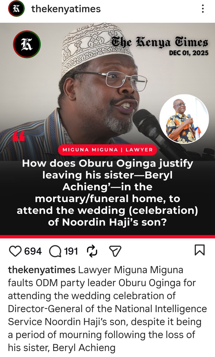 According to Miguna, it is not good for Oburu to leave Beryl in the mortuary and go on to attend a wedding celebration, he feels like Oburu should atleast observed the mourning period and show some empathy and respect to his late sister.