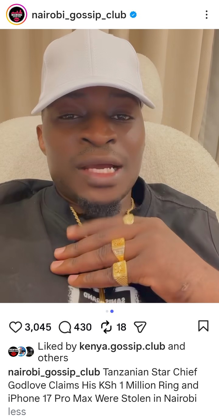 Tanzanian, controversial celebrity Chief Godlove , is counting losses, after he was robbed a golden ring worth Ksh.1 Million and a brand new iPhone 17 promax worth Ksh.350,000. All this theft happened in the streets of Nairobi.