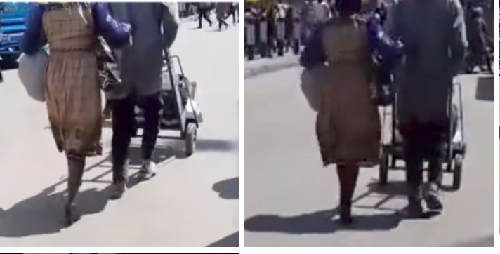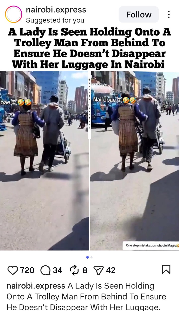 A Kenyan lady is going viral online, after she was spotted holding a trolley man from behind, in Nairobi CBD, to ensure that the man doesn’t disappear with her luggage.