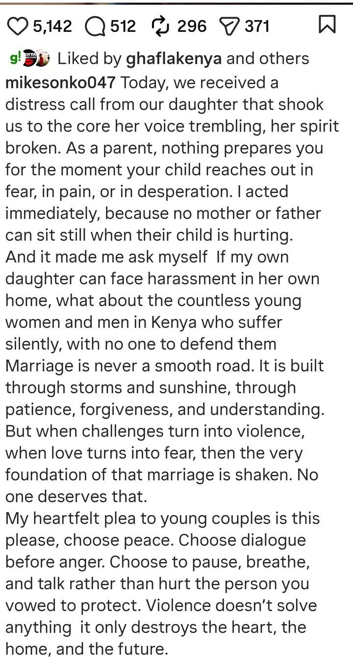 Mike Sonko shared a video confronting the man who has married his daughter Salma Mbuvi. This is after the man beat Salma, left her with some serious scars on her face, Sonko went to confront him, in the video Sonko told his son in law that he pays for everything in there house including the school fees and rent, yet he has the guts of beating Salma Mbuvi.