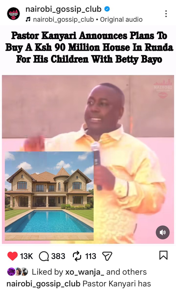 After the sudden death of a famous gospel musician Betty Bayo, Pastor Kanyari, who is the ex husband, has now decided to make sure that the children they had together are living a better life. He is now planning to buy a Ksh.90 Million mansion for them in the leafy suburbs of Runda estate.