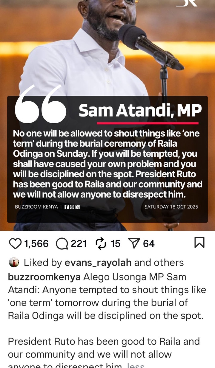 Alego Usonga MP has decided to threaten Kenyans who will be showing up at Raila Odinga’s funeral. Samuel Atandi who is among the MPs who are supporting William Ruto, has warned Kenyans against chanting WANTAM during the funeral of Raila Odinga.