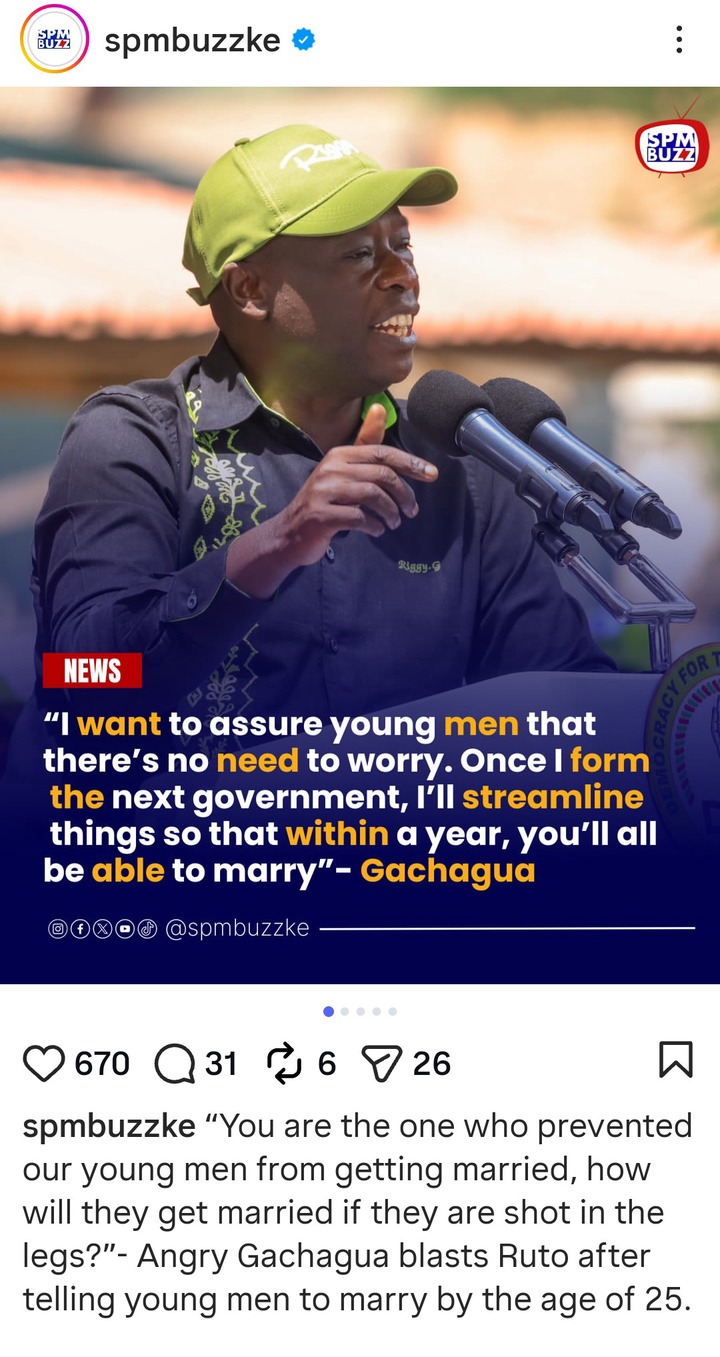 Former deputy president Rigathi Gachagua, who is the leader of DCP, has now decided to promise Kenyan men, that once he will form his own government, then marriage will not be a problem anymore.