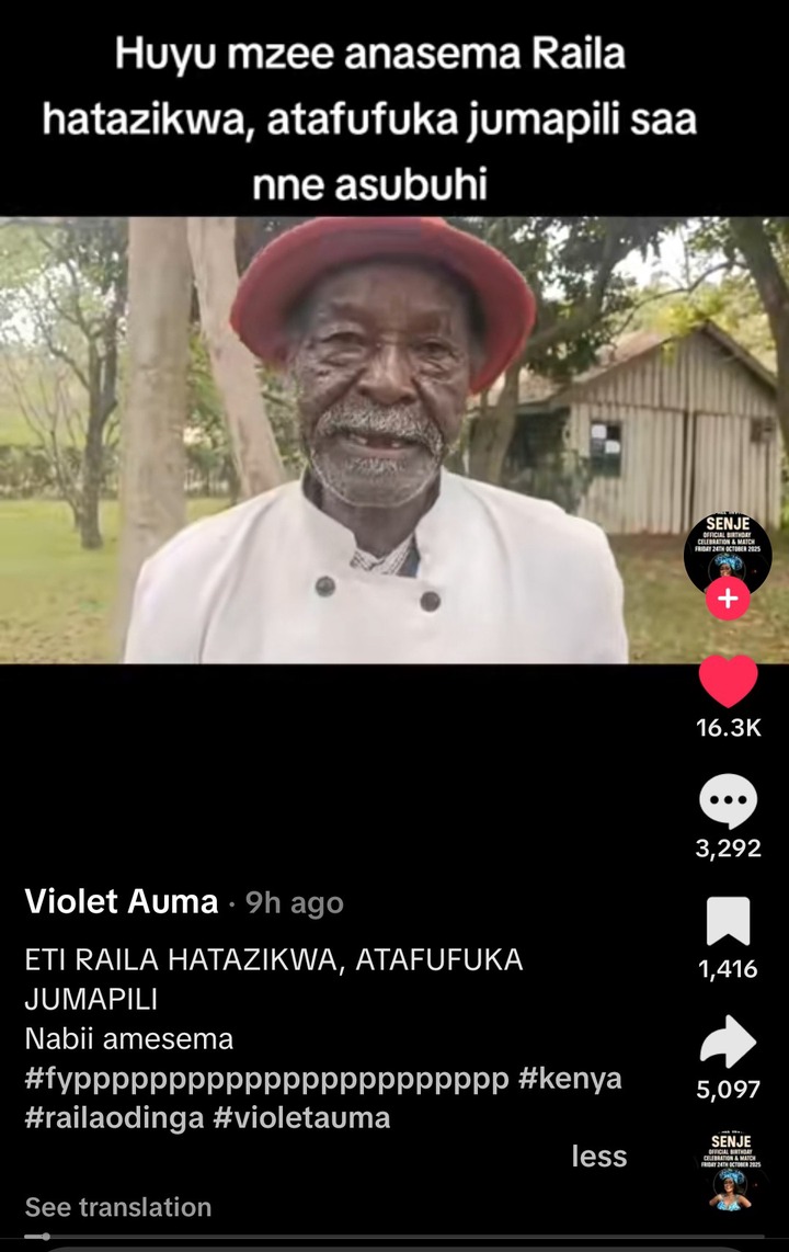 The prophet claimed that his prophecy has never failed, they have all came to pass. He believes that a person like Raila Odinga, they are people who are meant to live forever. He has urged his supporters not to worry, Raila is just resting and by Monday they will see him again alive and kicking.