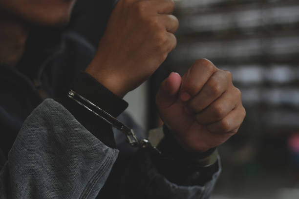 Robbers wearing a dark sweatshirt was handcuffs sitting on chair was investigated by police, Handcuffed Man over blurred black background