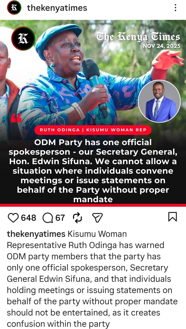 Raila Odinga’s sister Ruth Odinga has come out openly to defend Senator Sifuna. Ruth has made it clear that the person who communicates on behalf of the party, and tells Kenyans the decision of ODM is Sifuna, hence when Sifuna speaks, that is ODM speaking.