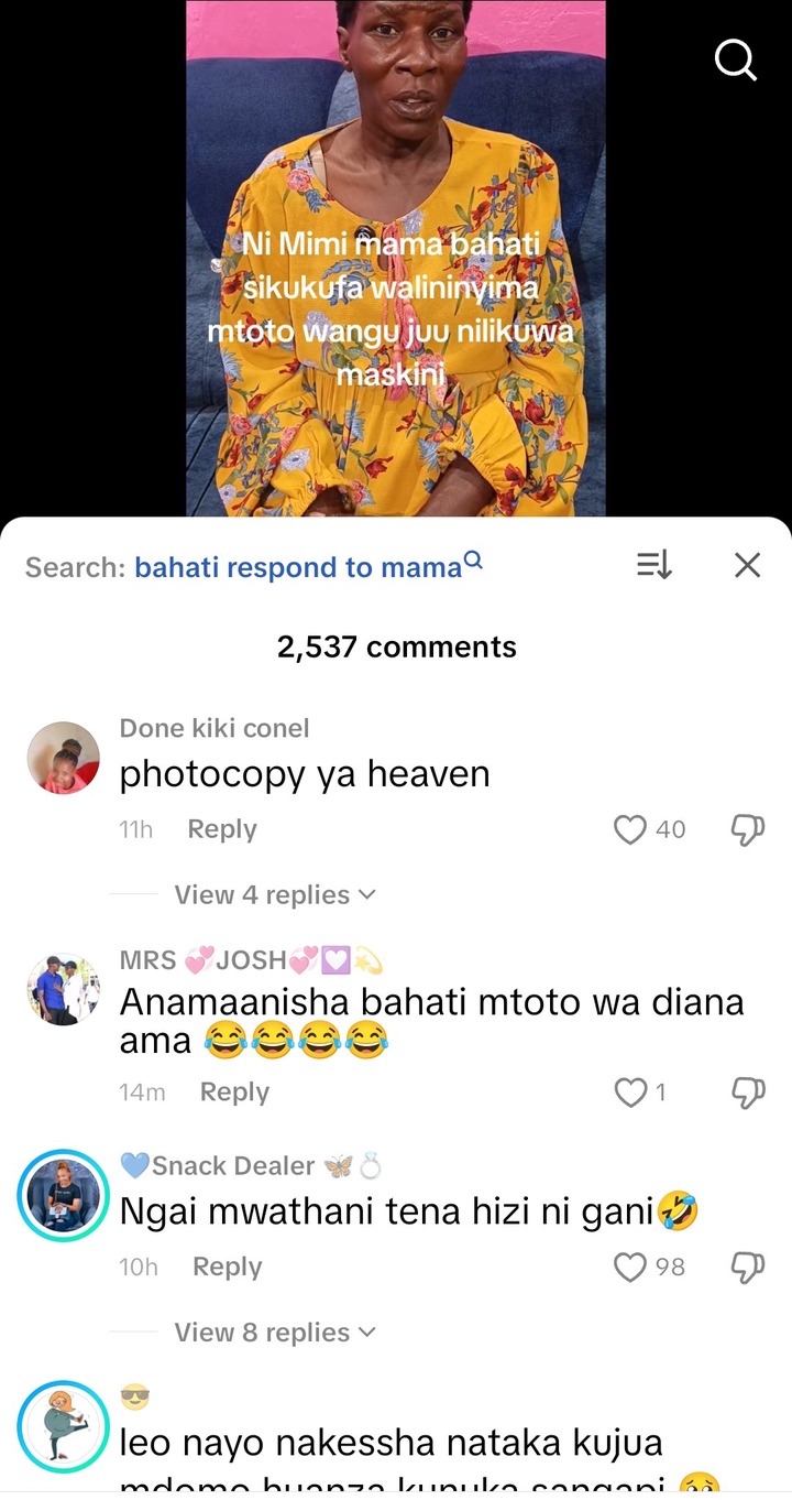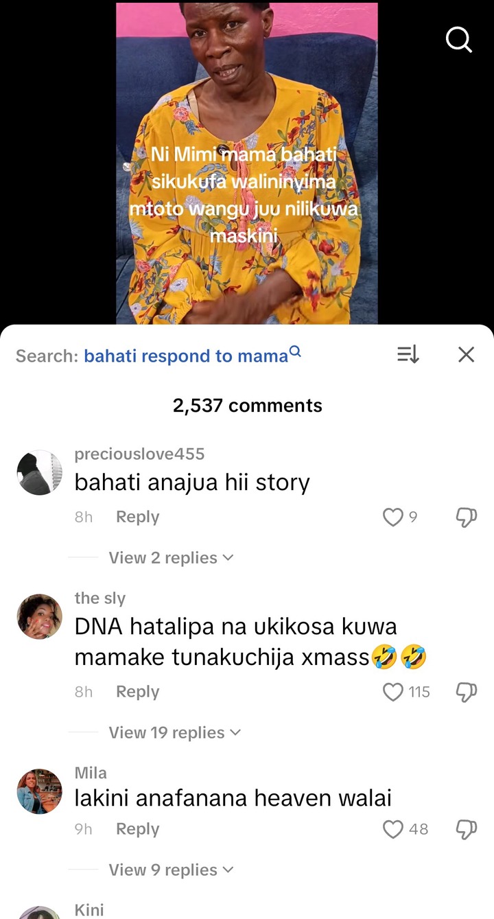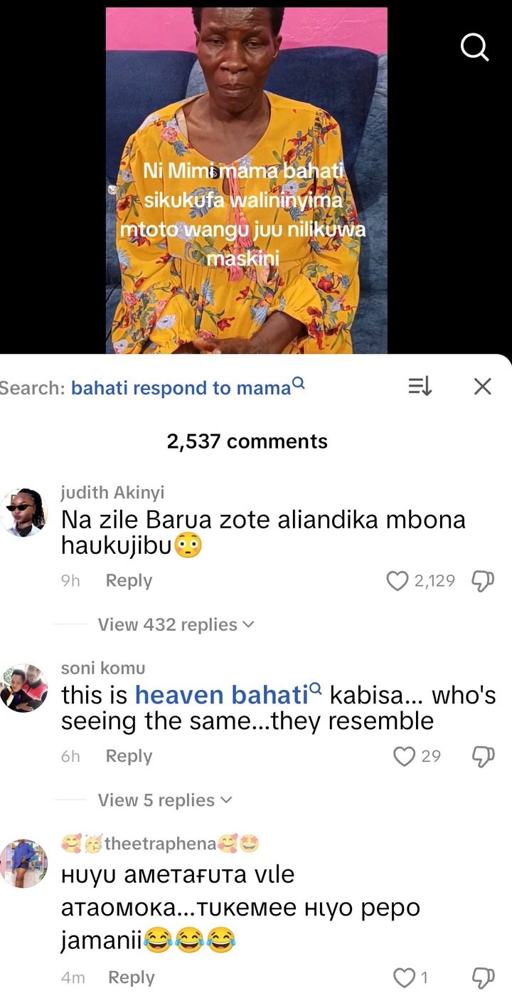 According to her, the holy spirit of God told her that Bahati is the child she abandoned, and now he is very successful in life. The woman asked Bahati to forgive her, and accept her as his mother. She said she has already forgiven Bahati for saying that his mother died, yet she is allegedly his mother and she is still alive.