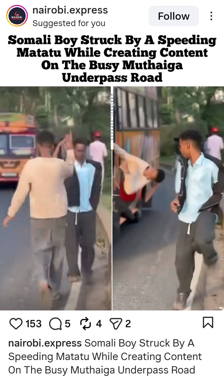 In the viral video online, a young Somali boy was hit badly by a moving Matatu, while he was shooting Tiktok video in the middle of the busy Muthaiga underpass road.