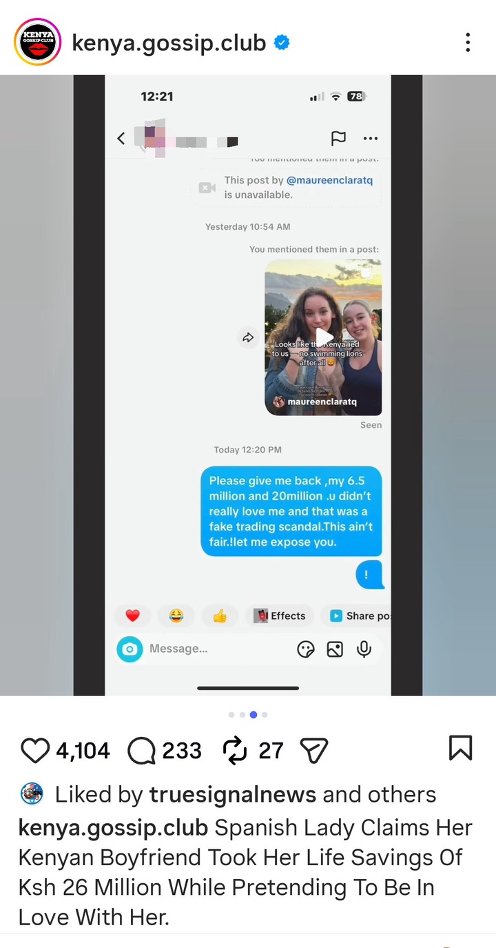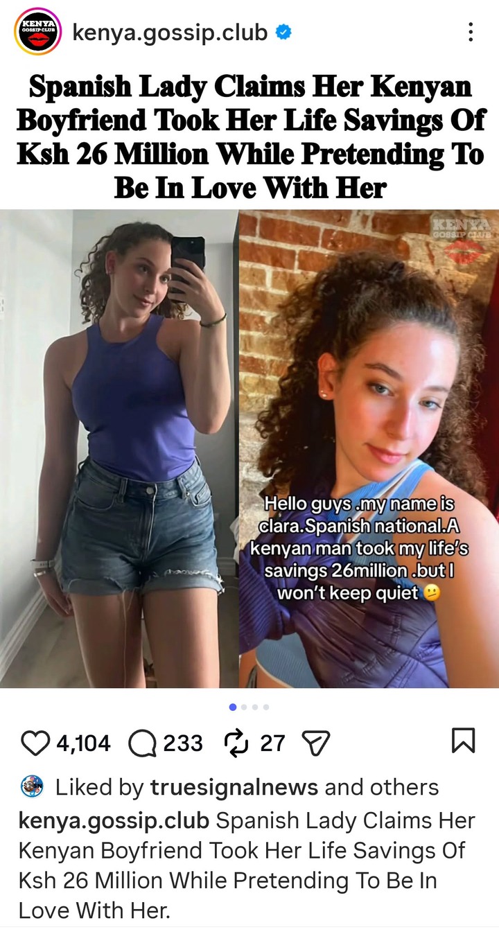 A Spanish woman is going viral online, after she exposed a Kenyan man, who pretended to be in love with her, and had even promised to marry her, then man went on took all her life savings of Ksh.26 Million in the name of love, then he disappeared.