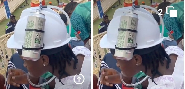 He decided to tie two cans of alcohol on his head, and made sure that they have balanced well, he then went on to come up with a very small pipe and he was using the pipe to suck alcohol from the cans he had tied on his head .
