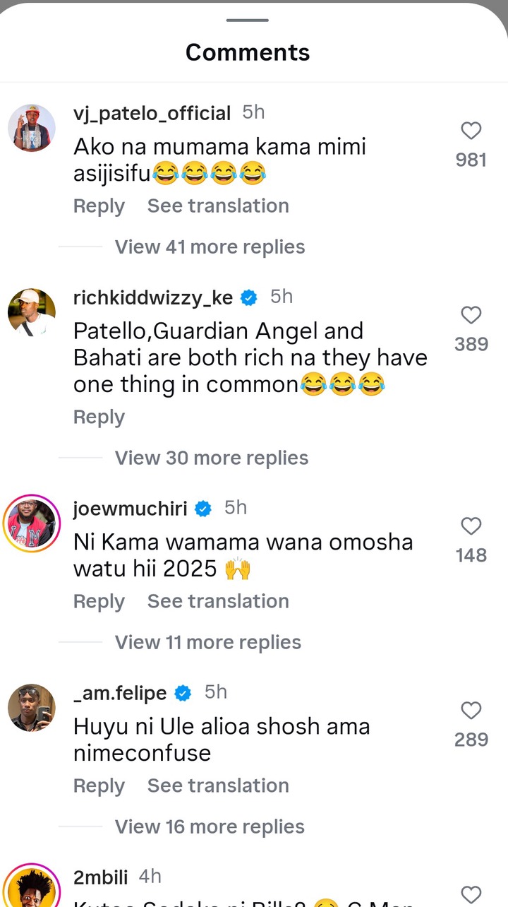 A number of celebrities also commented on the post, with most of them linking Guardian Angel’s wealthy lifestyle to Esther Musila. They believe that all that money comes from her and she is the one that is paying those bills.