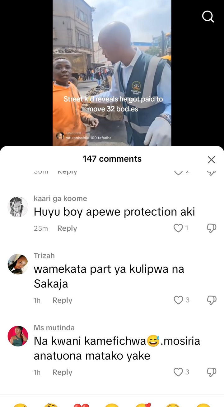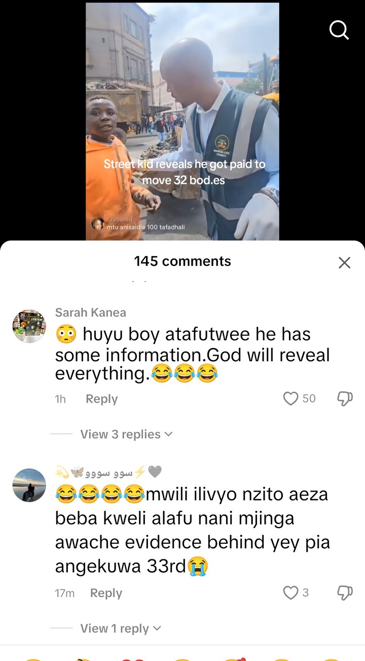 A video is currently going viral on Tiktok, Geoffrey Mosiria found a Nairobi Street Kid with money, he questioned him where he got the money from, the young boy said that they were paid on Maandamano day to move 32 dead bodies to mortuary.