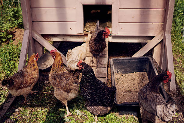 A group of chickens gather around a backyard chicken coop. The setting captures rural simplicity, with the chickens freely roaming and a clear view of the wooden coop and surrounding garden.