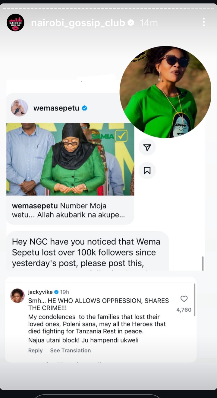 Diamond Platinumz former girlfriend Wema Sepetu decided to choose violence with Tanzanians, by sharing a post on her official Instagram page, praising president Samia Suluhu. In less than 24 hours, Wema Sepetu has already lost 100,000 followers.
